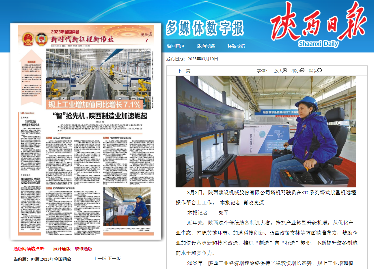 陜西日?qǐng)?bào) 2023年3月10日 7版把塔機(jī)操控室“請(qǐng)”到地面(本報(bào)記者 郭軍)2月28日,在西安市高陵區(qū)陜煤集團(tuán)所屬陜西建設(shè)機(jī)械股份有限公司(以下簡稱陜建機(jī)股份)工業(yè)園塔機(jī)發(fā)運(yùn)廣場,身高50米的塔機(jī)伸出長長的動(dòng)臂,來來回回吊運(yùn)材料?!按汗?jié)后,我們公司早早開工,塔機(jī)發(fā)運(yùn)也變得更加忙碌。”塔機(jī)駕駛員周先春說。與普通工地不同的是,塔機(jī)駕駛員沒有坐在駕駛室,而是坐在房間里對(duì)塔機(jī)進(jìn)行遙控操作?!耙郧霸谒C(jī)上一待就是半天,連水都不敢喝,就怕上廁所。而且坐在幾十米高空,尤其對(duì)我們這些女塔機(jī)駕駛員來說,心理壓力特別大?!敝芟?..
