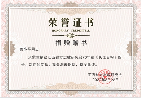2月22日,陜建機(jī)股份公司職工姜小平收到了江西省方志敏研究會頒發(fā)的捐贈證書,感謝他慷慨捐贈4份70多年前《長江日報》的原版報紙,這些珍貴的史料再現(xiàn)了“方志敏同志戰(zhàn)斗的一生”。“敵人只能砍下我的頭顱,決不能動搖我的意志!”“朋友,我相信,到那時,到處都是活躍的創(chuàng)造,到處都是日新月異的進(jìn)步……”1935年,方志敏同志被捕后面對國民黨反動派威逼利誘,在獄中寫下鏗鏘誓言以及對未來美好中國的期盼。今天讀來,我們?nèi)匀粸橹畡尤?,深刻感受到老一輩共產(chǎn)黨人為了革命理想不懼任何犧牲的豪邁情懷。2022年1月21日,21歲的方瀚輝(方志敏曾孫...